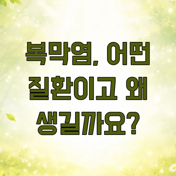 복막염은 복강 내 염증으로, 심한 경우 생명을 위협할 수도 있는 심각한 질환이에요. 복통, 발열, 메스꺼움 등 다양한 증상들이 나타날 수 있으니, 조기에 알아채고 신속하게 대처하는 것이 무엇보다 중요하답니다.