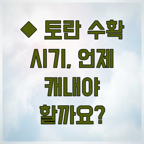 토란은 보통 두 가지를 수확할 수 있어요. 바로 줄기인 '토란대'와 뿌리 부분인 '알토란'이지요. 토란대는 잎이 누렇게 변하기 시작하는 가을, 그러니까 9월 말에서 10월 중순 사이에 수확하는 것이 가장 좋아요. 알토란은 토란대가 완전히 말라 죽은 후, 서리가 내리고 나서 약 일주일 뒤에 캐는 것이 가장 적절하답니다. 이렇게 수확 시기를 잘 맞춰야 토란의 맛과 영양을 제대로 즐길 수 있어요.